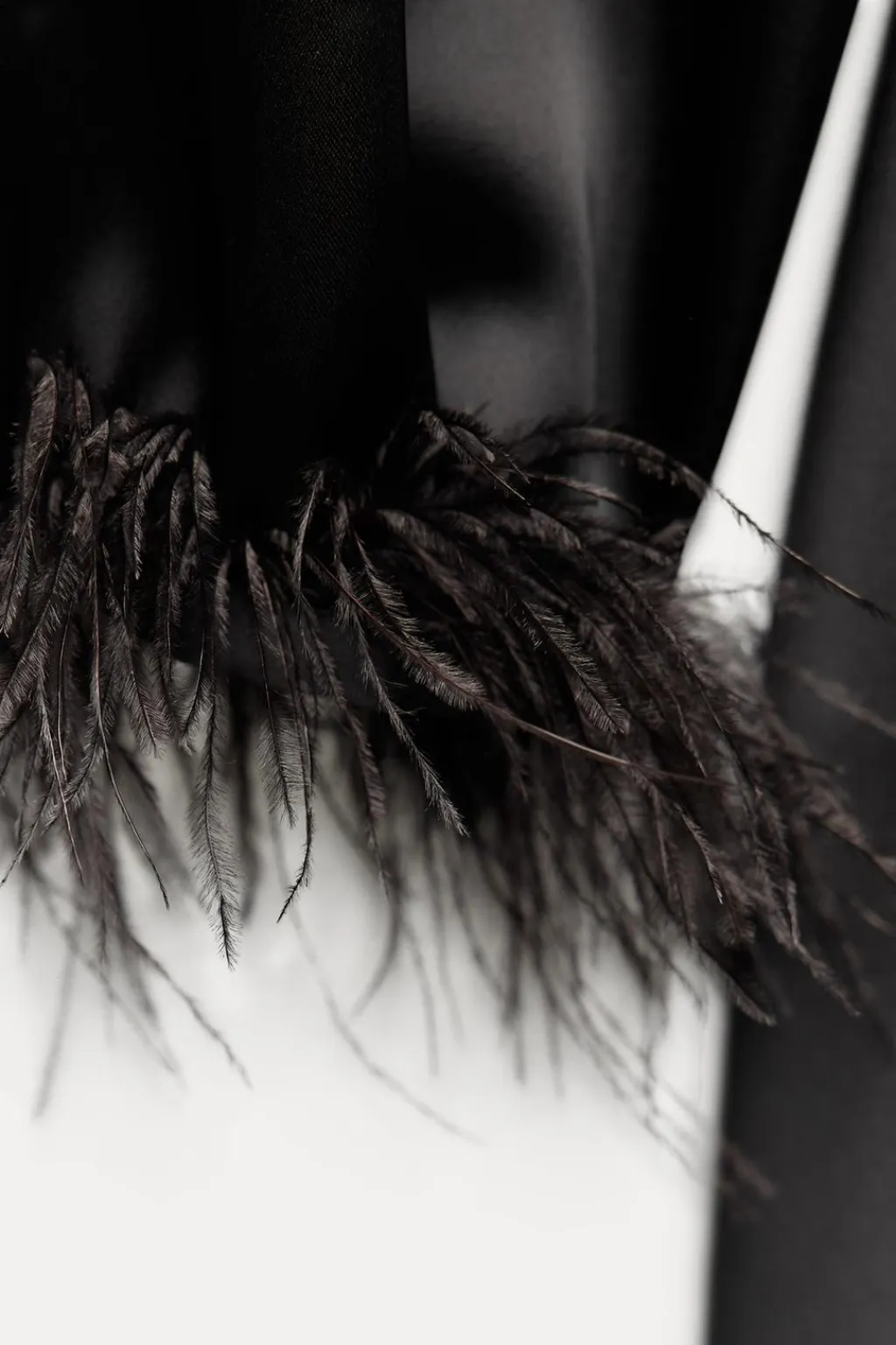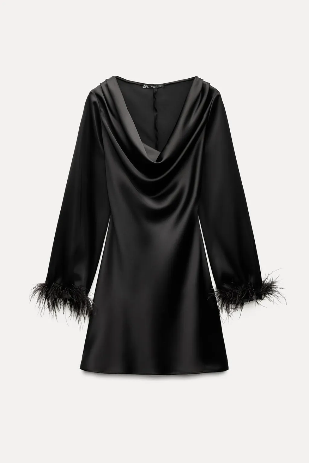 Vestido de escote fluido y manga larga acabada con plumas y pliegues en hombros.