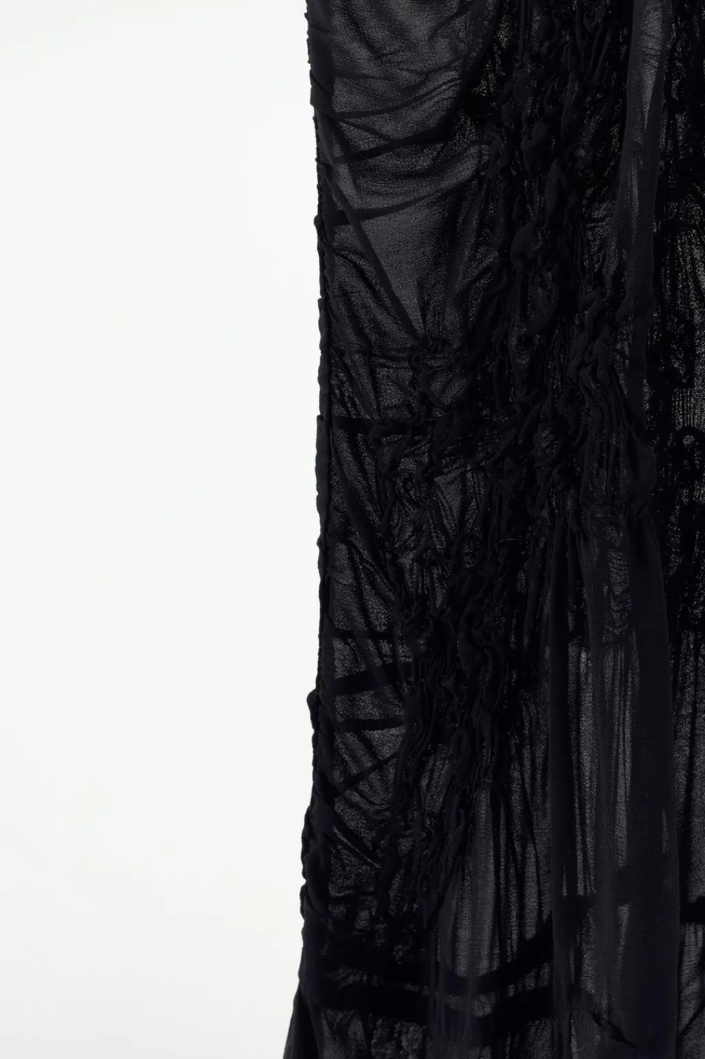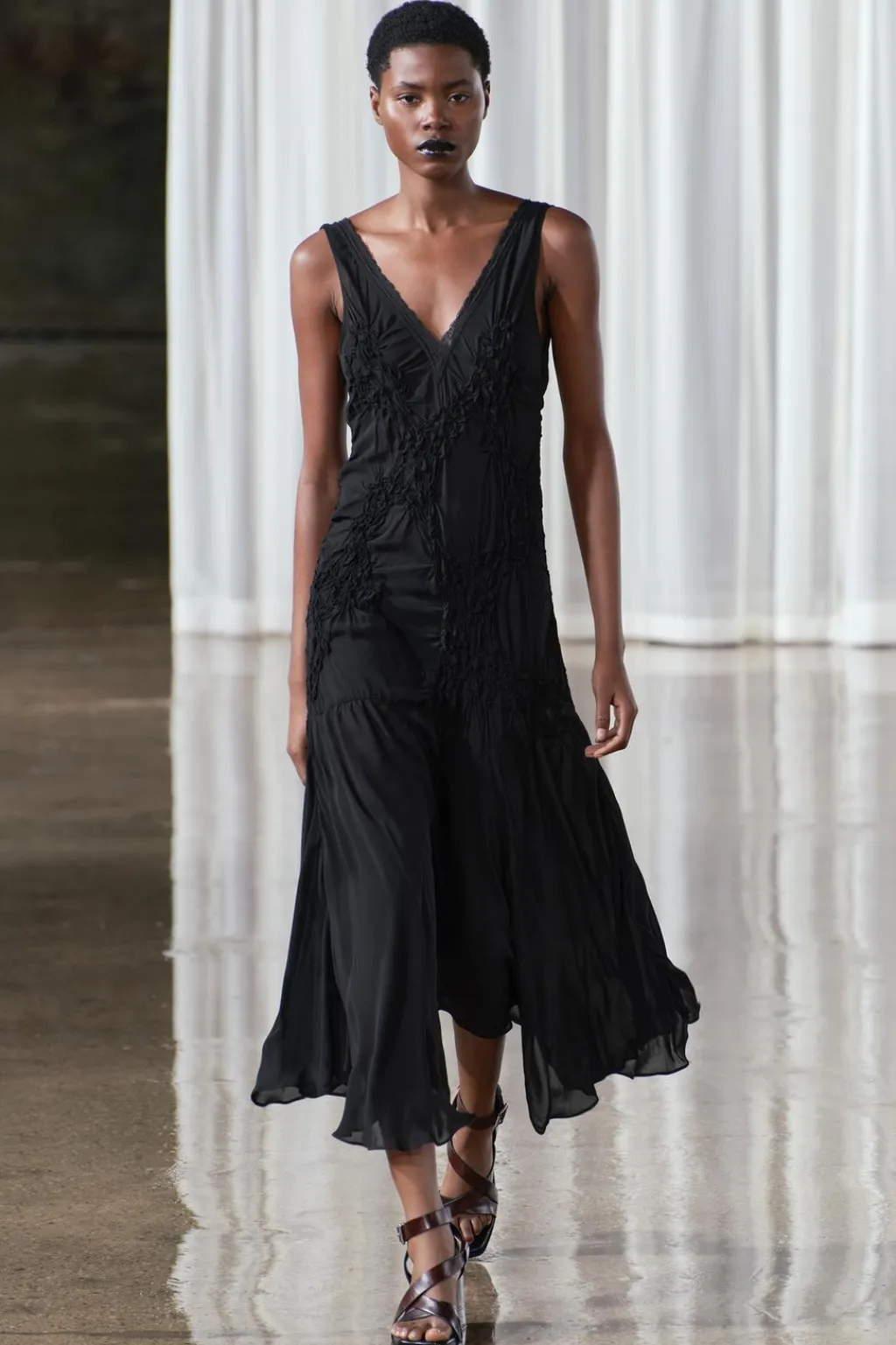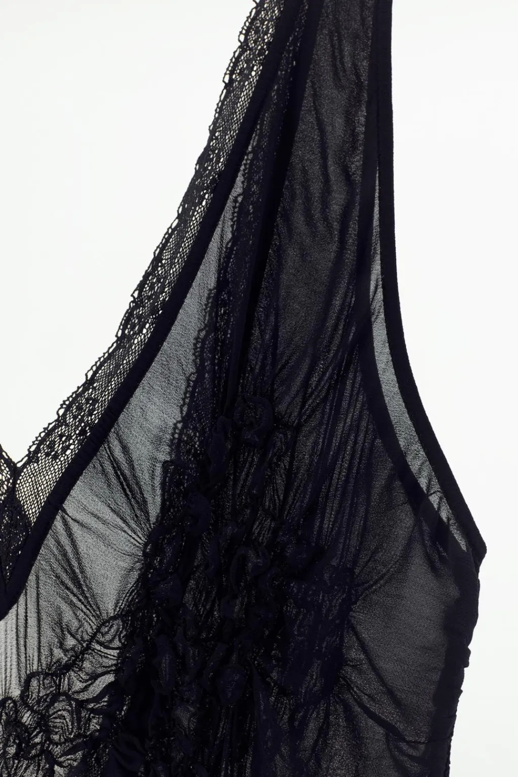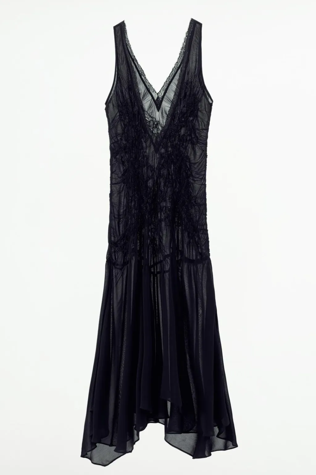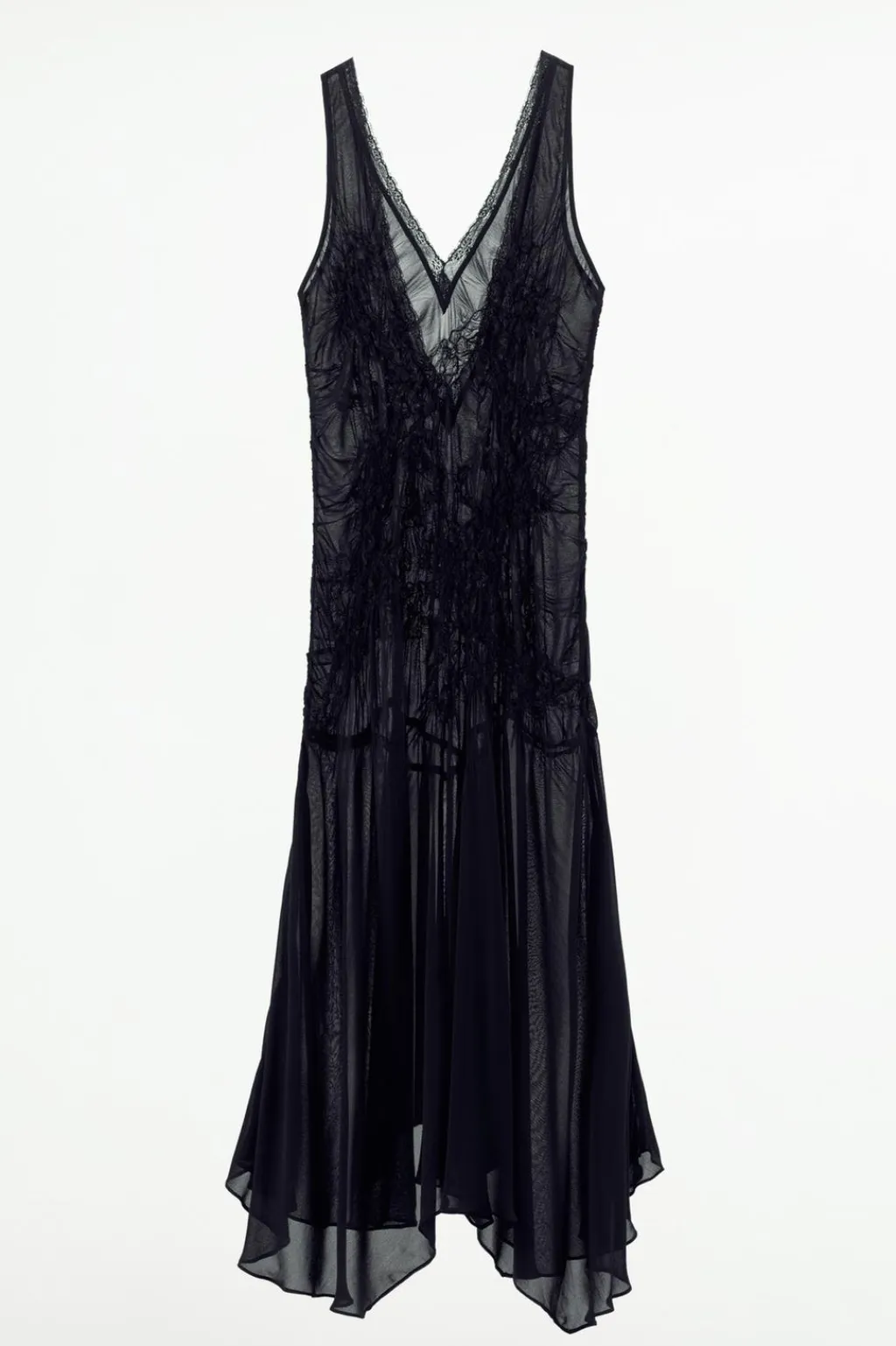 Vestido semitransparente de escote pico con encaje combinado a tono y tirantes anchos. Detalle de tejido con textura. Bajo acabado asimétrico.