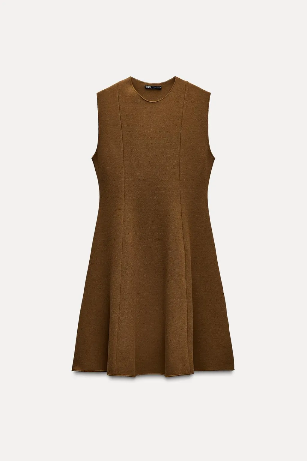 Vestido corto confeccionado en tejido tipo punto. Cuello redondo y manga sisa. Bajo acabado en vuelo.