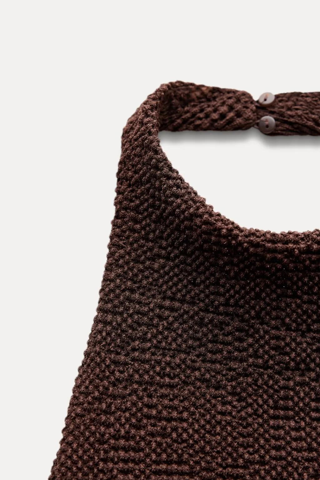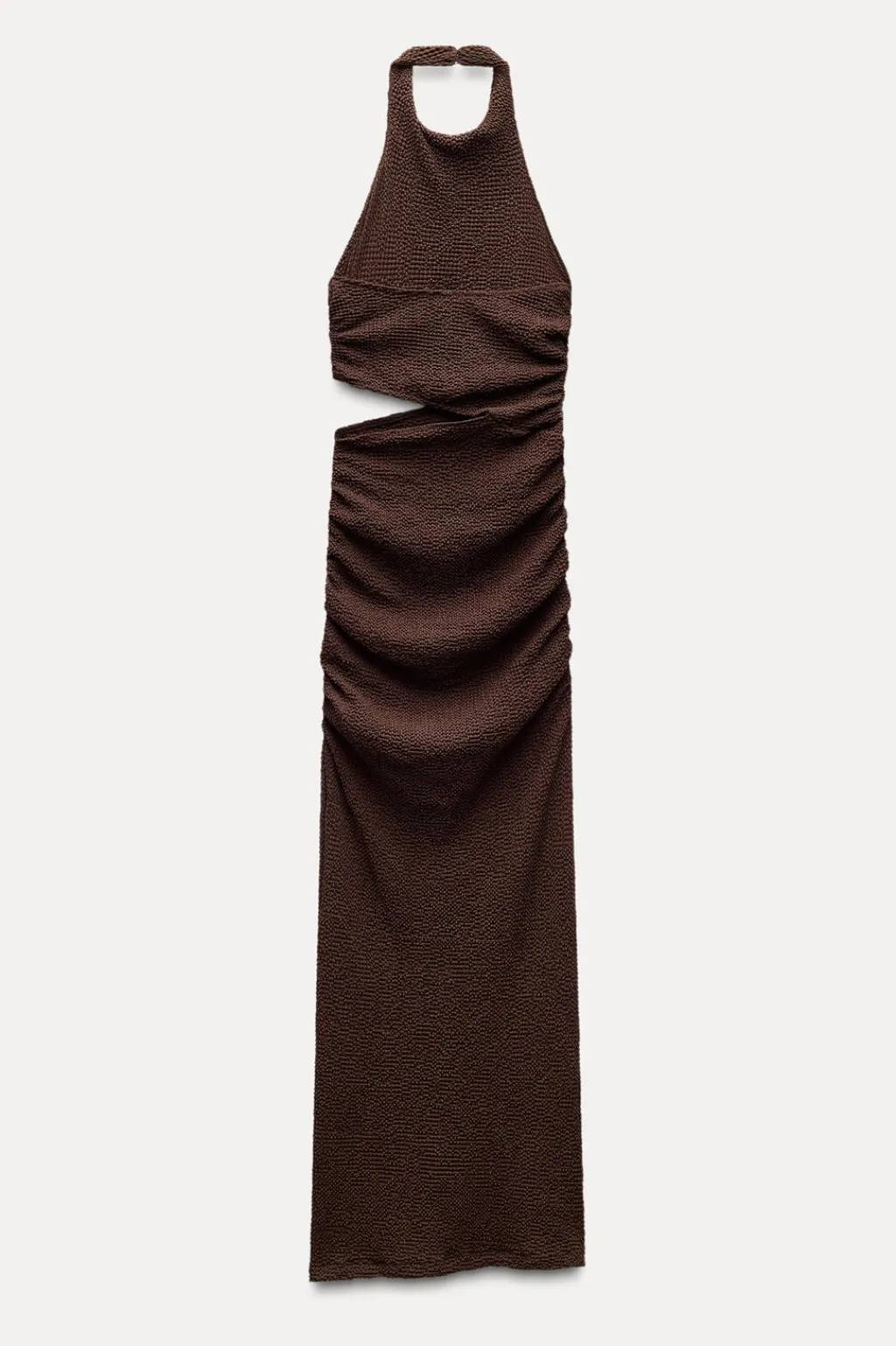 Vestido midi confeccionado en tejido con textura. Cuello halter con botones. Detalle de abertura y frunces.