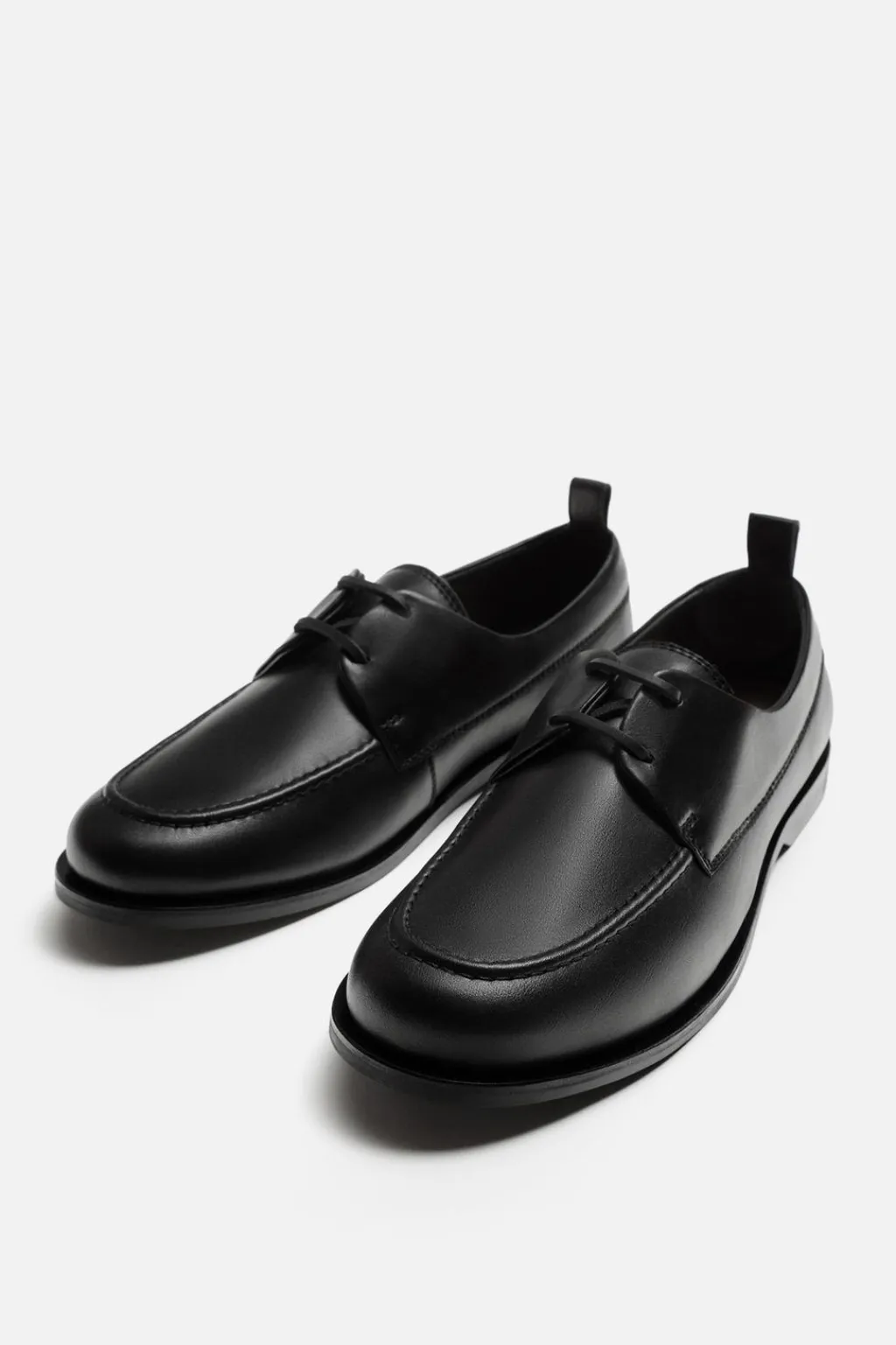Zapato confeccionado en piel de alta calidad. Bordón en el empeine. Horma redonda. TIrador en al parte trasera.