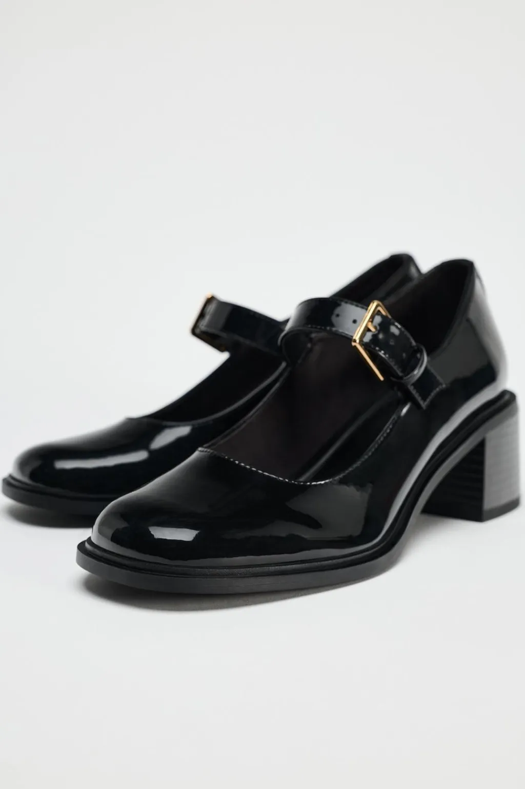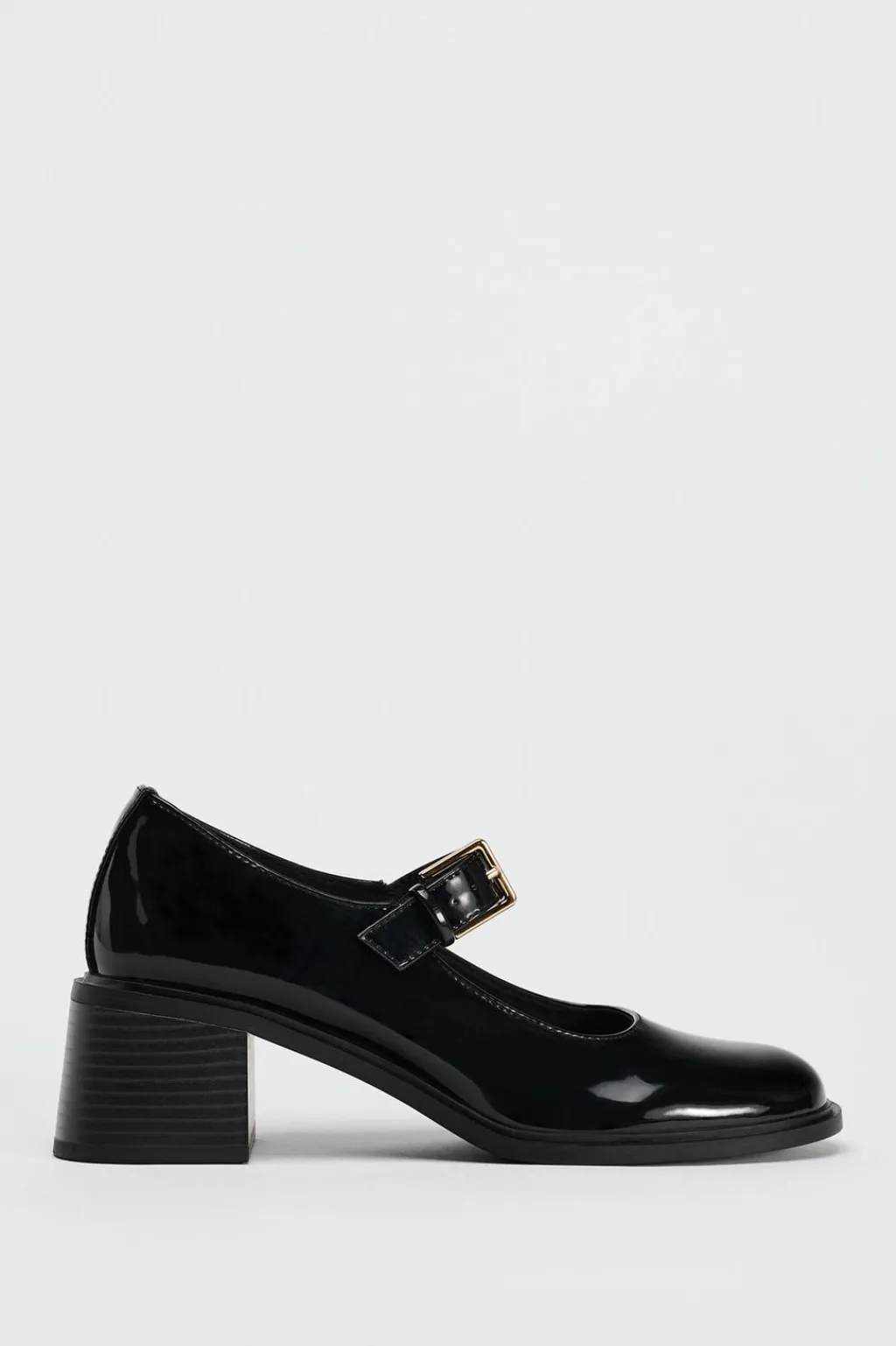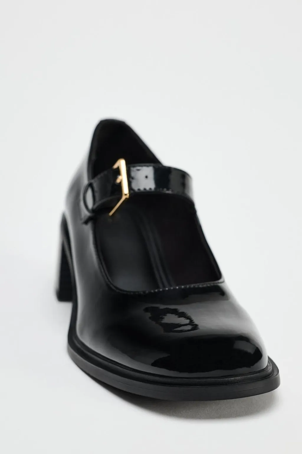 Zapato tacón ancho en efecto acharolado. Tira con hebilla ajustable en la parte delantera. Acabado en punta redonda.