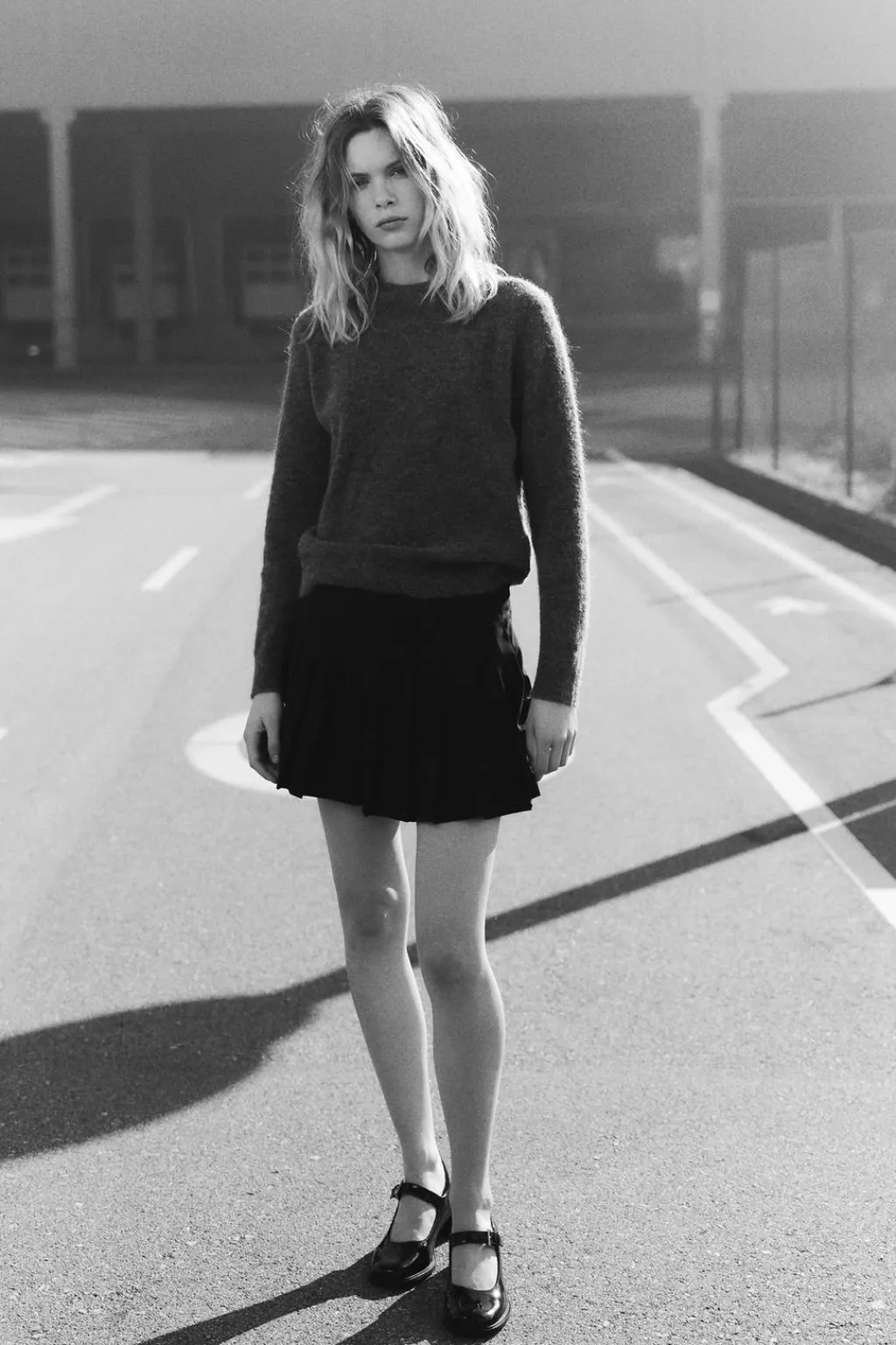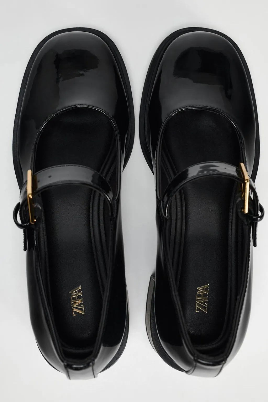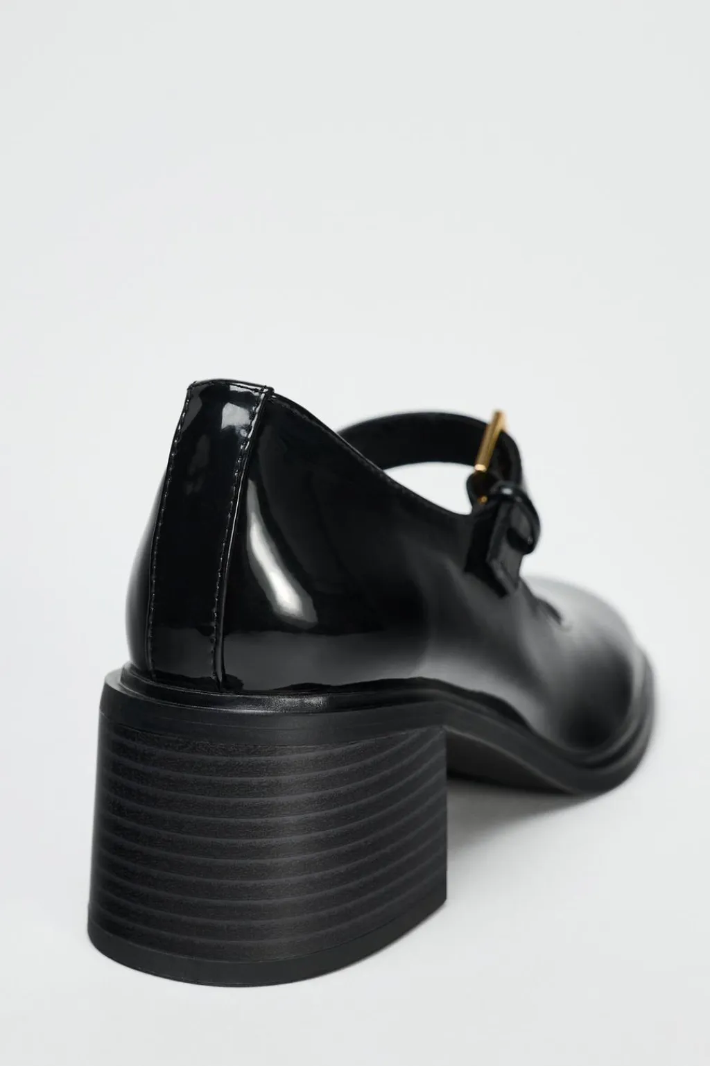 Zapato tacón ancho en efecto acharolado. Tira con hebilla ajustable en la parte delantera. Acabado en punta redonda.